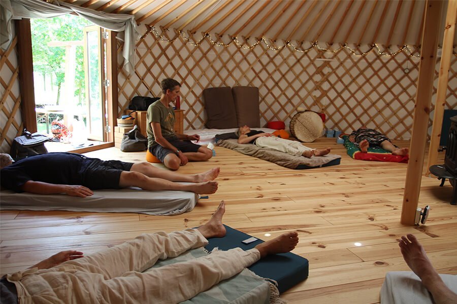 Zondag 10 augustus zijn 10 deelnemers bereid geweest de allereerste ademcirkel in onze kersverse yurt te ondergaan. Het ging er verhit aan toe, niet alleen door de opzwepende muziek, maar ook door de zomerse temperaturen, waar in de yurt nog een paar graden bij kwam.